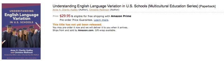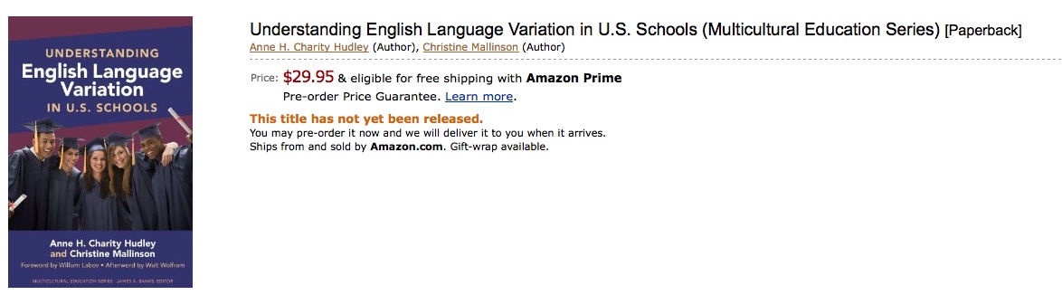 Our book Understanding English Language Variation in U.S. Schools is now available for pre-sale on Amazon.com! Click here to go to the page.